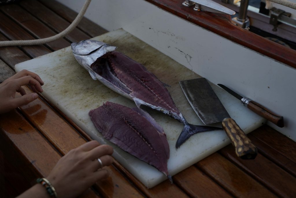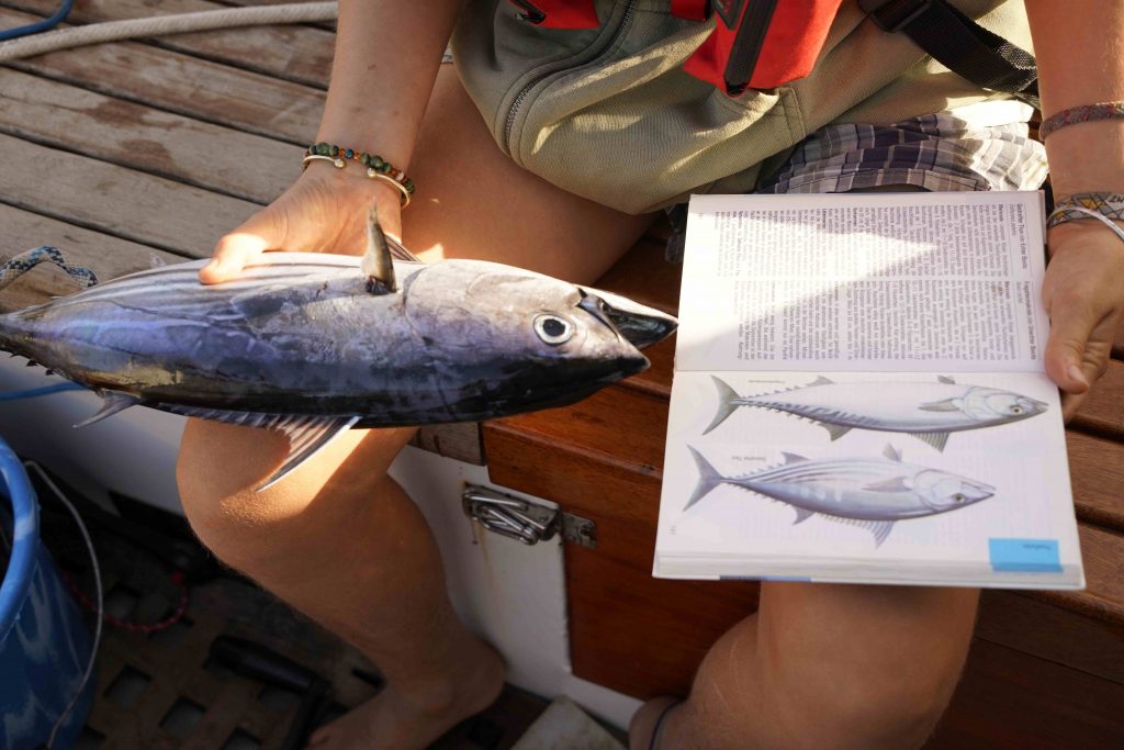 Then we had a big gust of wind that tipped us a good bit to the side, a wave splashed in the bed and we caught a tuna all at the same time. The fish swam around the rudder of the windsteering just as we were pulling it in, and the blurred shape of some preditor came into view underneath it. Who’s dinner was it going to be?
