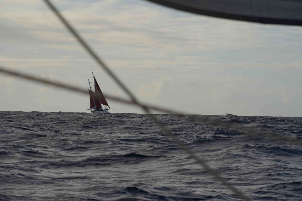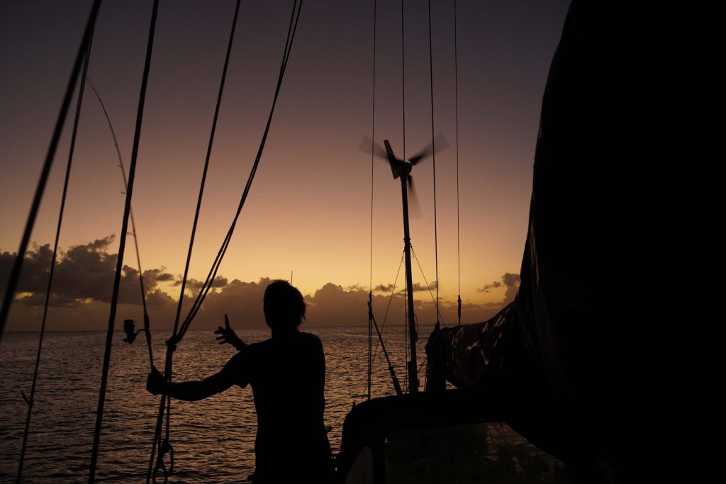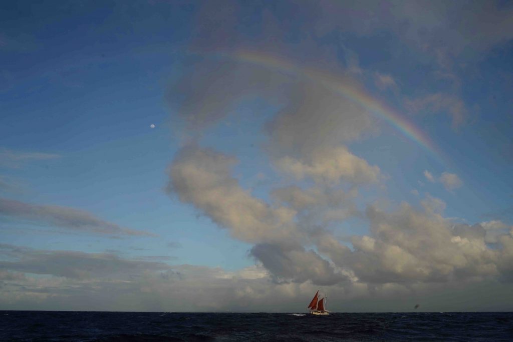 The sail from Barbados to Martinique started around 3pm, we were a bit behind the others with preparing the boat, but the conditions were lovely to catch up which we did by the time night fell. It was a gorgeous afternoon, quite windy and a few patches of rain moved across the sky catching us only briefly. Some impressive double rainbows arched above us and I got some beautiful pictures of Frifa under the rainbow with the big moon hanging around nearby.